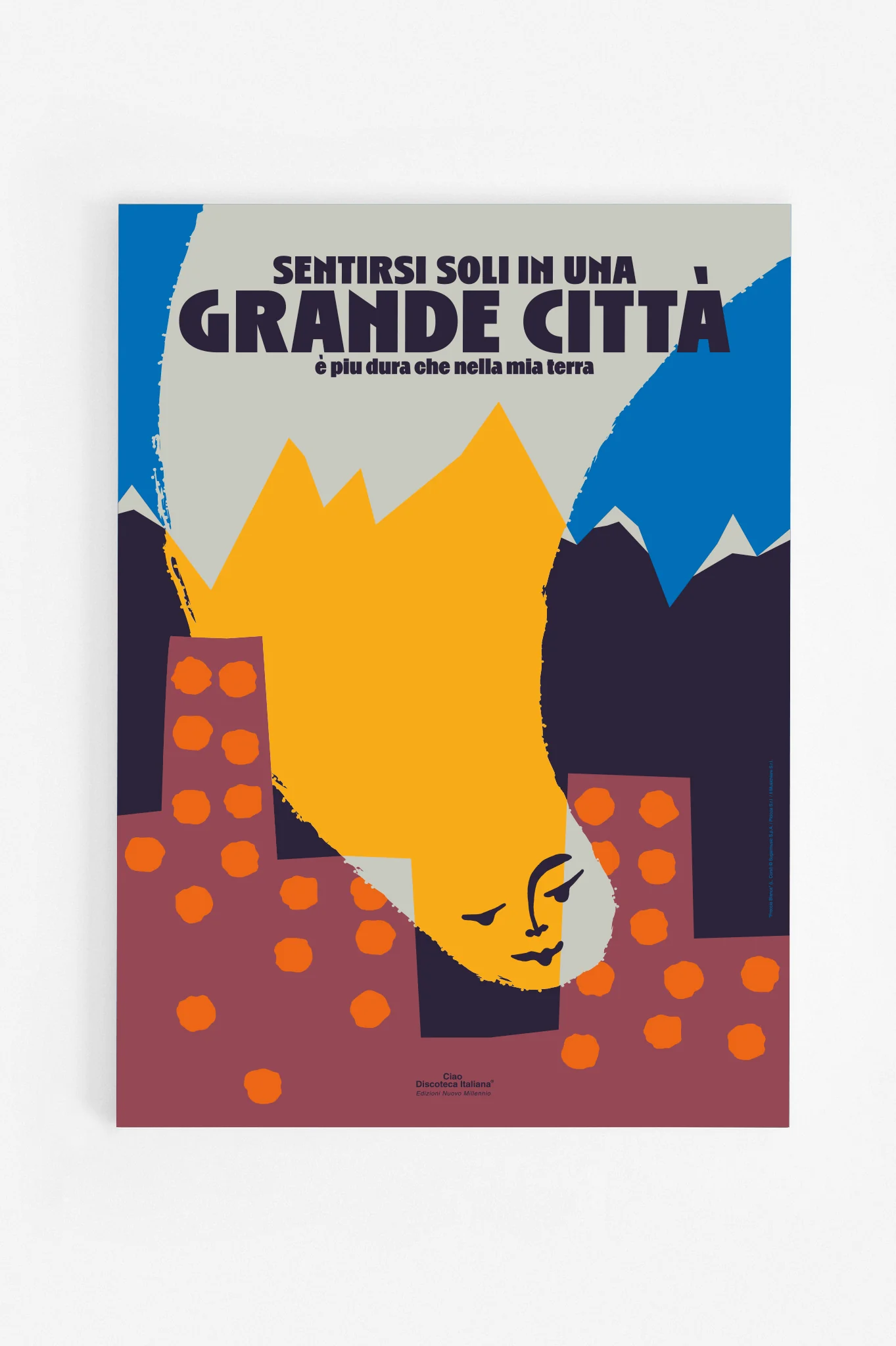 "Freccia Bianca" è l’inno dei fuori sede che macinano chilometri a bordo di un treno lento e che sognano di vedere il verde tra il grigio smog. La città matrigna, cantata nel 2020 da Lucio Corsi, è tornata tra i nostri ascolti dopo il boom di Sanremo. Un successo che il collettivo artistico torinese Ciao Discoteca Italiana ha voluto celebrare, dedicando una serie al cantautore fenomeno del momento nella collana Nuovo Millennio. “Sentirsi soli in una grande città / È più dura che nella mia terra”, recita il poster, mentre una luce calda umanizzata scende dalle «armi bianche, le punte delle Alpi», fino ai grattacieli, custodi di «Troppe pareti, troppi muri / Dove sbattere la testa». Perché mai non dovremmo sfasciarcela su un muro tappezzato di grafiche originali? Per i più affezionati al musicista maremmano ci sono anche i poster di "La volpe" e di "Nel cuore della notte", tutti in tiratura limitata numerata a mano.